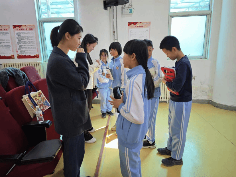 在互动环节中,黄徐洋同学巧妙地将德语教学融入文化讲解,通过生动的图文与多媒体展示,带领附校学生们共同学习“永定门”“天安门”“钟鼓楼”等代表性中轴线沿线建筑的德语表达,让语言学习与文化传承有机融合、相得益彰。同时,北外附校的学生们也在互动环节获得来自YABO鸭脖官网本科生党支部学长学姐准备的德语特色明信片。