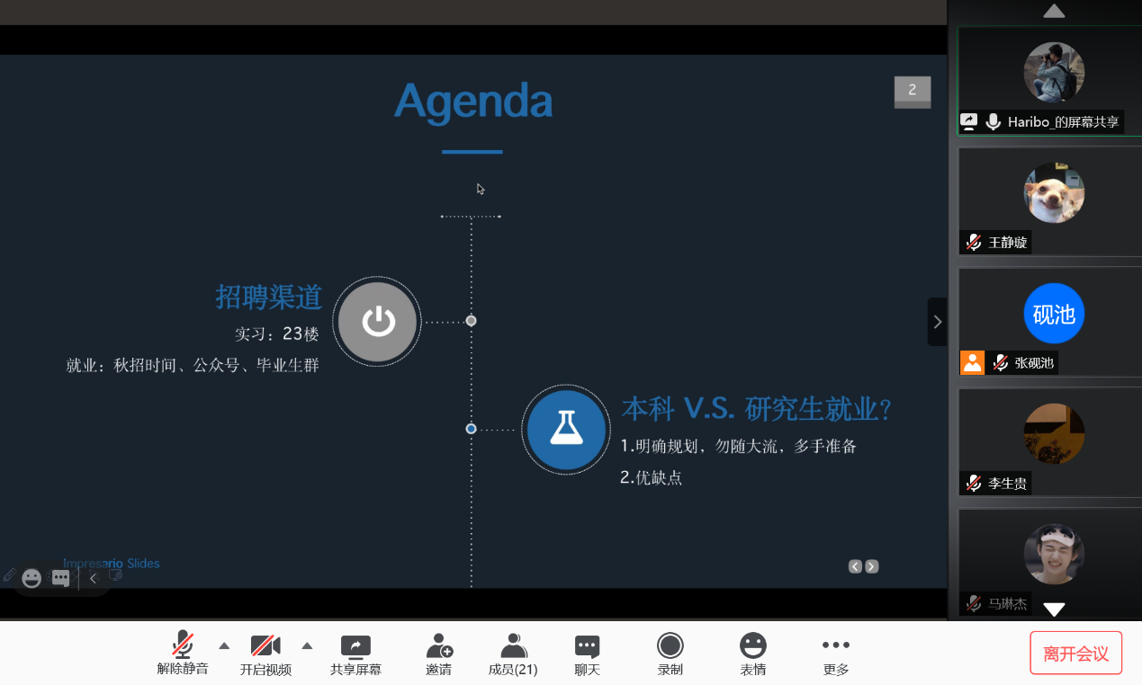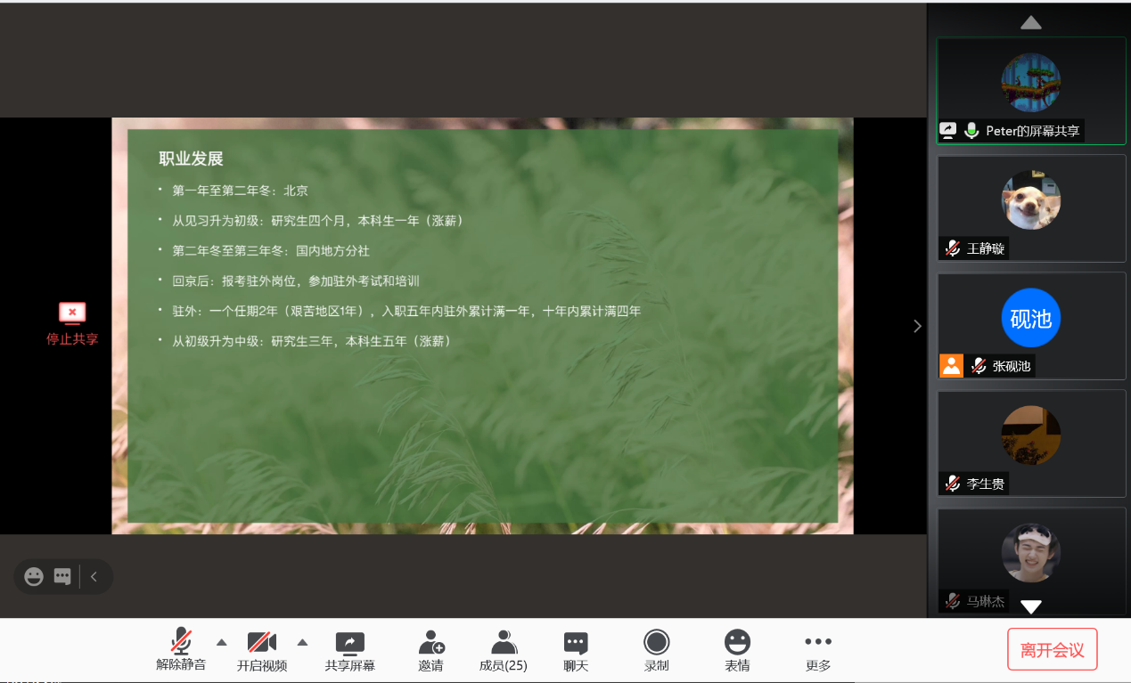 2020年12月8日,YABO鸭脖官网新华社就业经验分享会以线上会议方式成功举行。YABO鸭脖官网2019届本科毕业生车云龙及2019届硕士毕业生(德国外交与经济方向)贾金明受邀与YABO鸭脖官网本科生、研究生分享了新华社具体情况、就业经验及备考建议,并解答了同学们的问题。会议由YABO鸭脖官网研究生会主办,研究生会张砚池主持。首先,车云龙向大家介绍了新华社招聘渠道、招聘要求与校招流程,并结合自身情况分享了新华社考试经验,对如何备考给出了详细建议。随后,贾金明向大家介绍了新华社入职之后的工作模式,就大家十分关心的新华社职业发展与待遇问题做了详尽的说明。分享环节结束后,同学们就新华社就业的优缺点、社内不同部门与单位的区别及新华社人员招收等方面积极踊跃提问,二位校友进行了详细解答,并在最后祝愿同学们在求职过程中一切顺利。