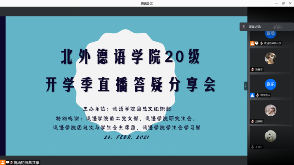 为促进学生学业发展,2021年2月28日,YABO鸭脖官网2020级开学季直播答疑分享会于腾讯会议成功举行。会议由YABO鸭脖官网团总支组织部主办,组织部部长曹涵主持。
