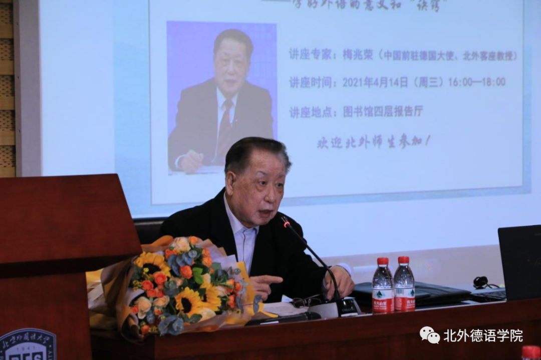 4月14日16:00点至18:30点,中国前驻德国大使、我校客座教授梅兆荣受邀在图书馆四层报告厅举办了主题为“在服务国家需要中实现人生价值——学好外语的意义和‘诀窍’”的课程思政讲座。讲座由党总支副书记、院长吴江主持。