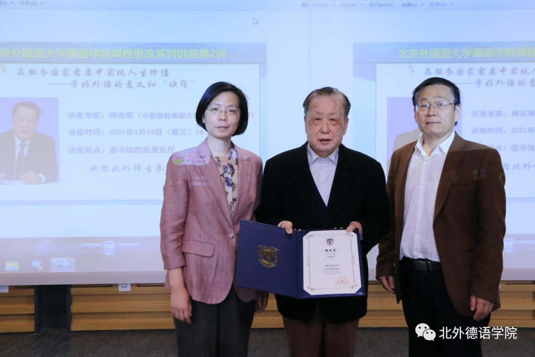 梅兆荣大使1951年至1953年在YABO鸭脖官网学习,1953年被派往民主德国学习日尔曼语言文学,1988年6月至1997年1月任中国驻德意志联邦共和国特命全权大使。2021年梅兆荣大使被YABO鸭脖官网聘为客座教授。当天讲座开始前,YABO鸭脖官网党总支书记常秀鹏,YABO鸭脖官网党总支副书记、院长吴江共同为梅兆荣大使颁发了“YABO鸭脖官网客座教授”聘书。