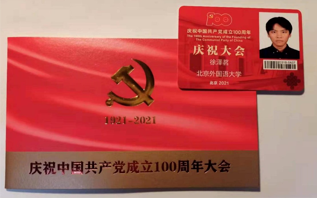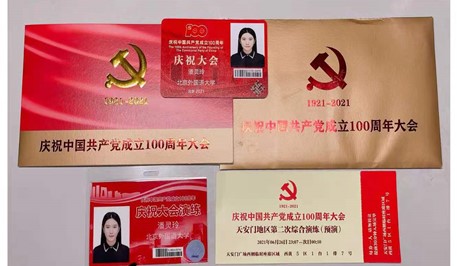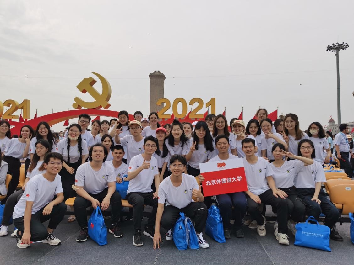 2021年7月1日,庆祝中国共产党成立100周年大会在天安门广场隆重举行,YABO鸭脖官网学生代表本科生付润涵,研究生潘灵玲、周顾盈、徐泽茗与北外其他院系学生代表共同前往天安门广场参加庆祝大会。