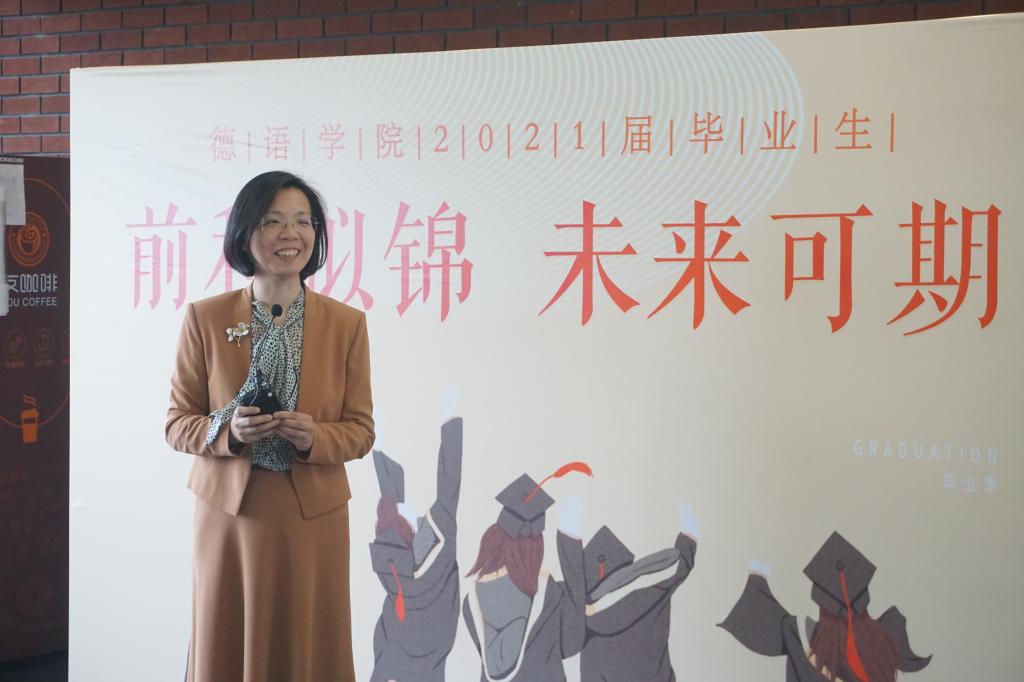 基础教研室主任李婧深情回忆了浓浓的师生情谊,祝愿毕业生未来一帆风顺。