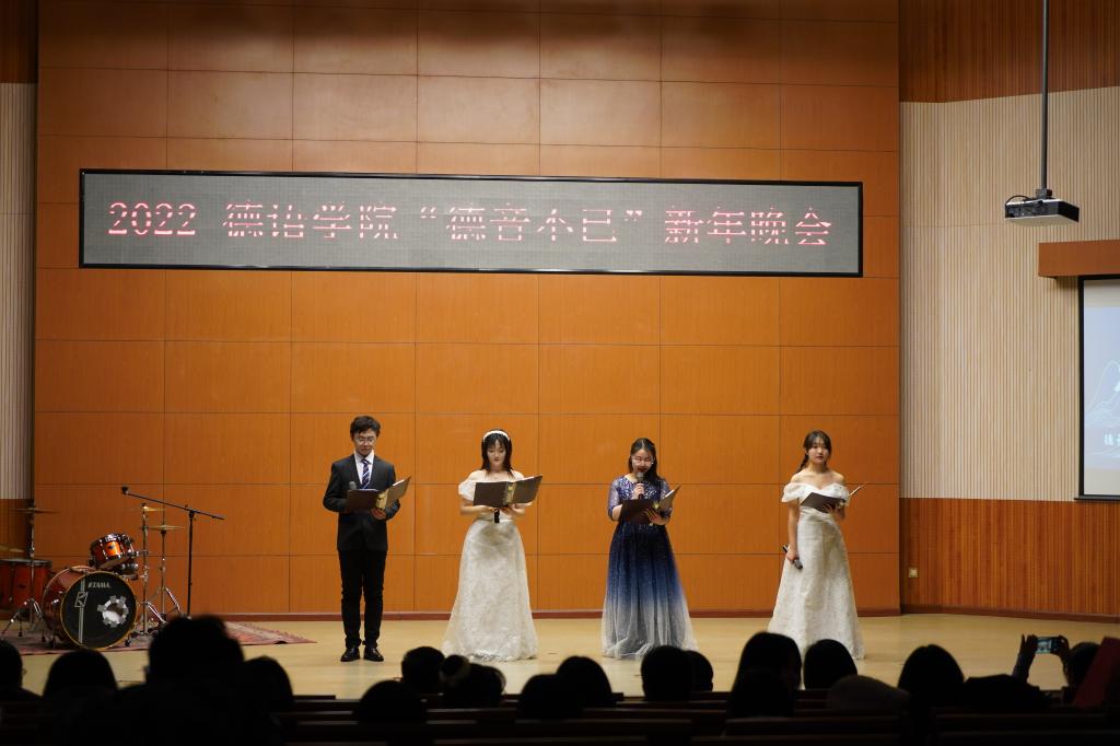党总支副书记、院长吴江首先发表新年致辞,她用“德忆、德听、德行、德欣、德思、德辩、德音”等七个词总结YABO鸭脖官网2021年各项工作,感恩YABO鸭脖官网师生们的辛勤付出,向各位老师、同学们送上诚挚的新年祝福!晚会在YABO鸭脖官网师生们温馨的新年祝福视频中拉开序幕,YABO鸭脖官网老师和同学们各显神通,带来了舞蹈、朗诵、歌曲、电影配音、乐器演奏等节目,精彩纷呈,高潮迭起。