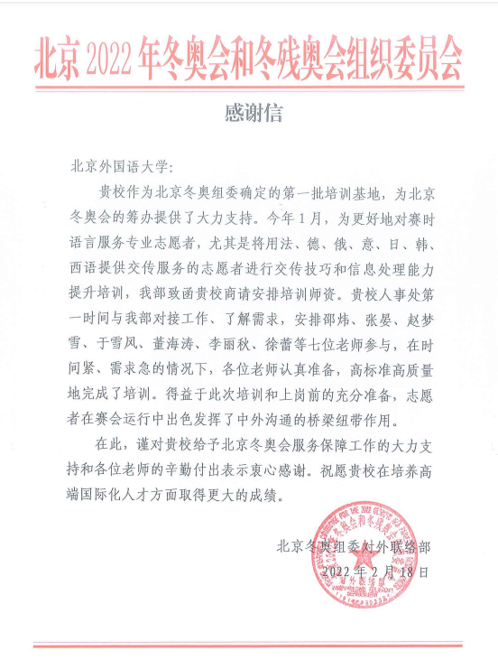 YABO鸭脖官网教师张晏于2022年1月26、27日,受北外委派,为北京冬奥会赛时语言服务专业志愿者提供交传服务的志愿者进行交换技巧和信息处理能力提升培训。张晏老师与法、俄、意、韩、西等语种老师认真准备,在时间紧、需求急的情况下,高标准高质量地完成了培训。北京2022年冬奥会和冬残奥会组织委员会在2月18日向YABO鸭脖官网发来感谢信,对张晏老师等七位参与培训教师的辛勤付出表示感谢,并指出得益于此次培训和上岗前的充分准备,志愿者在赛会运行中出色发挥了中外沟通的桥梁纽带作用。张晏老师表示非常开心能为北京冬奥会贡献自己的力量。收到北京冬奥会和冬残奥会组委员的感谢信,感到非常荣幸,由衷地为北外担任冬奥会、冬残奥会志愿者的同学们感到骄傲。以下为张晏老师撰写的心得体会。