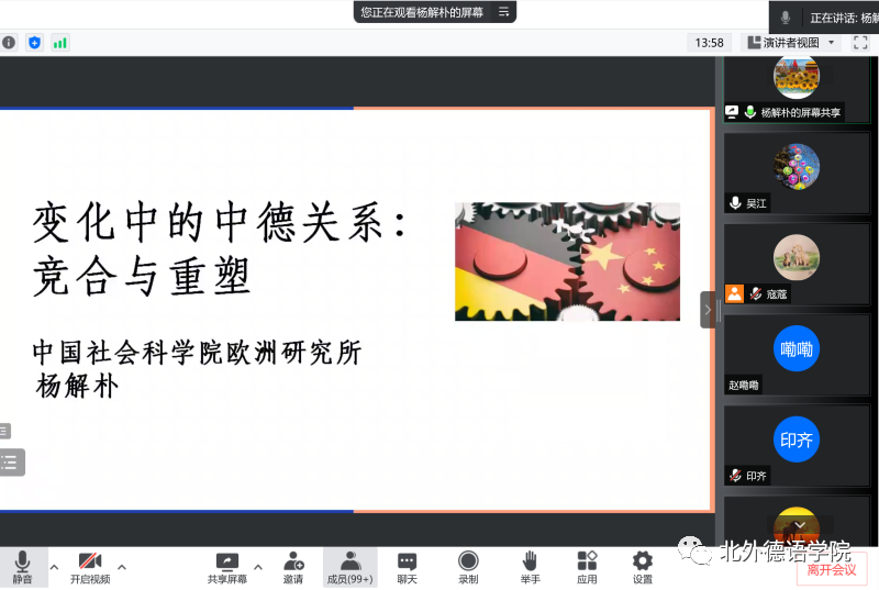 在最后的讨论环节,杨解朴和云端参会的师生们进行了充分交流和讨论,回答了有关中德民间外交和文化交流、德国绿党以及德国新任领导人等多个领域的问题。