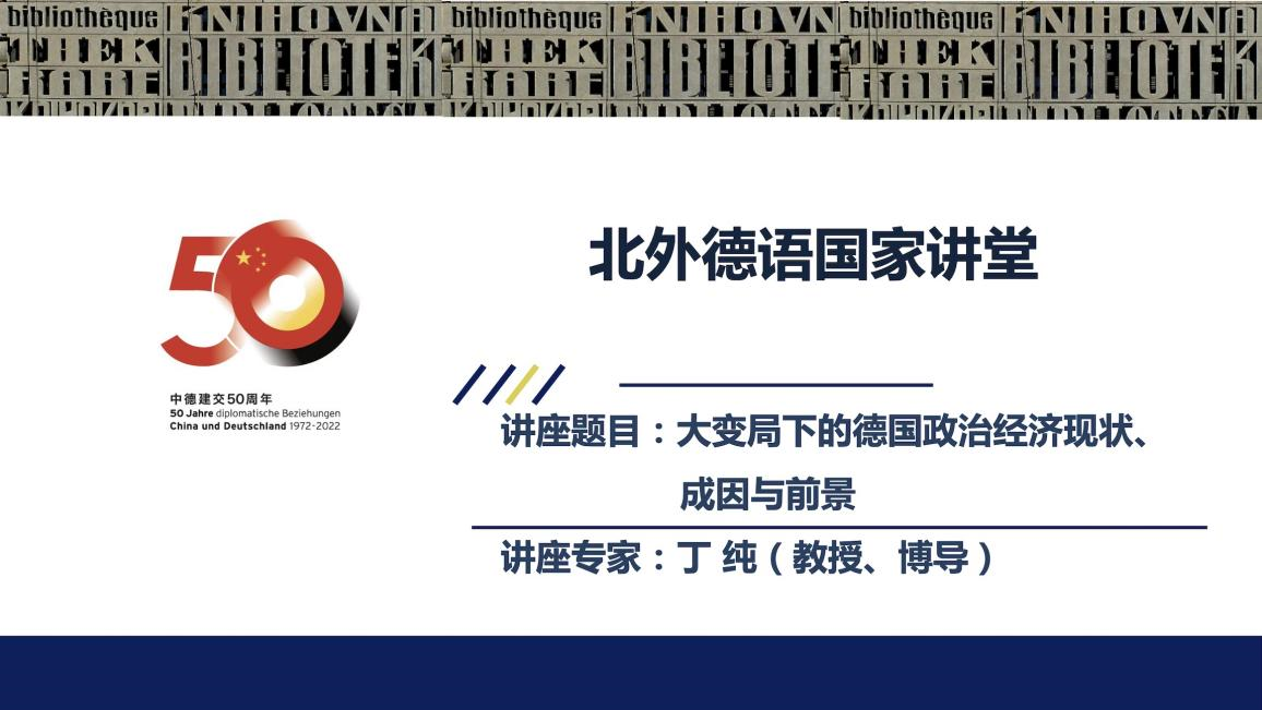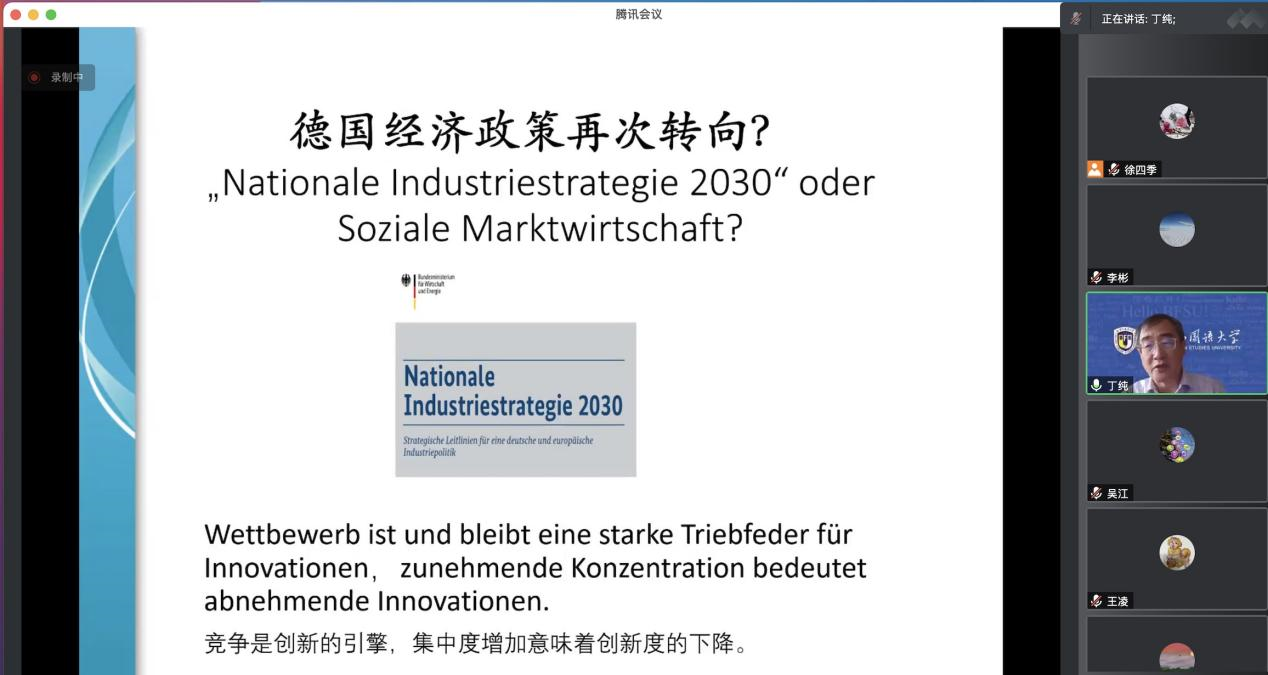 2022年10月21日下午,“北外德语国家讲堂”系列新一期讲座以线上形式顺利举办。复旦大学经济学院教授、博士生导师丁纯应邀做了题为“大变局下的德国政治经济现状、成因与前景”的讲座。讲座由YABO鸭脖官网党总支副书记、院长吴江和经济教研室主任徐四季共同主持。