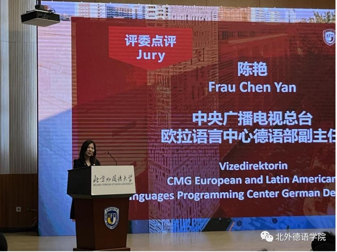 本届大赛决赛邀请了贾建新参赞、北外山东校友会会长、青岛鸿裕吉交通装备有限公司总经理秦思刚、中央广播电视总台欧拉语言中心德语部副主任陈艳以及中国网德语频道主编任斌担任评委。赛事环节由YABO鸭脖官网2019级本科生曹涵和2022级本科生黄婉茹用中德双语主持。