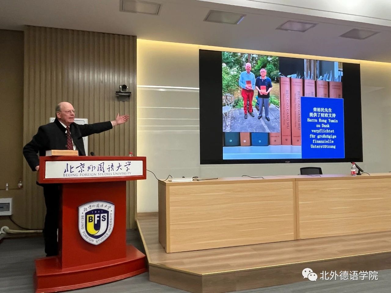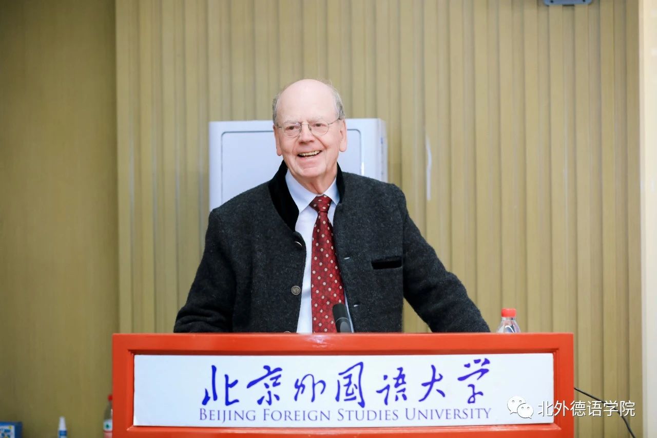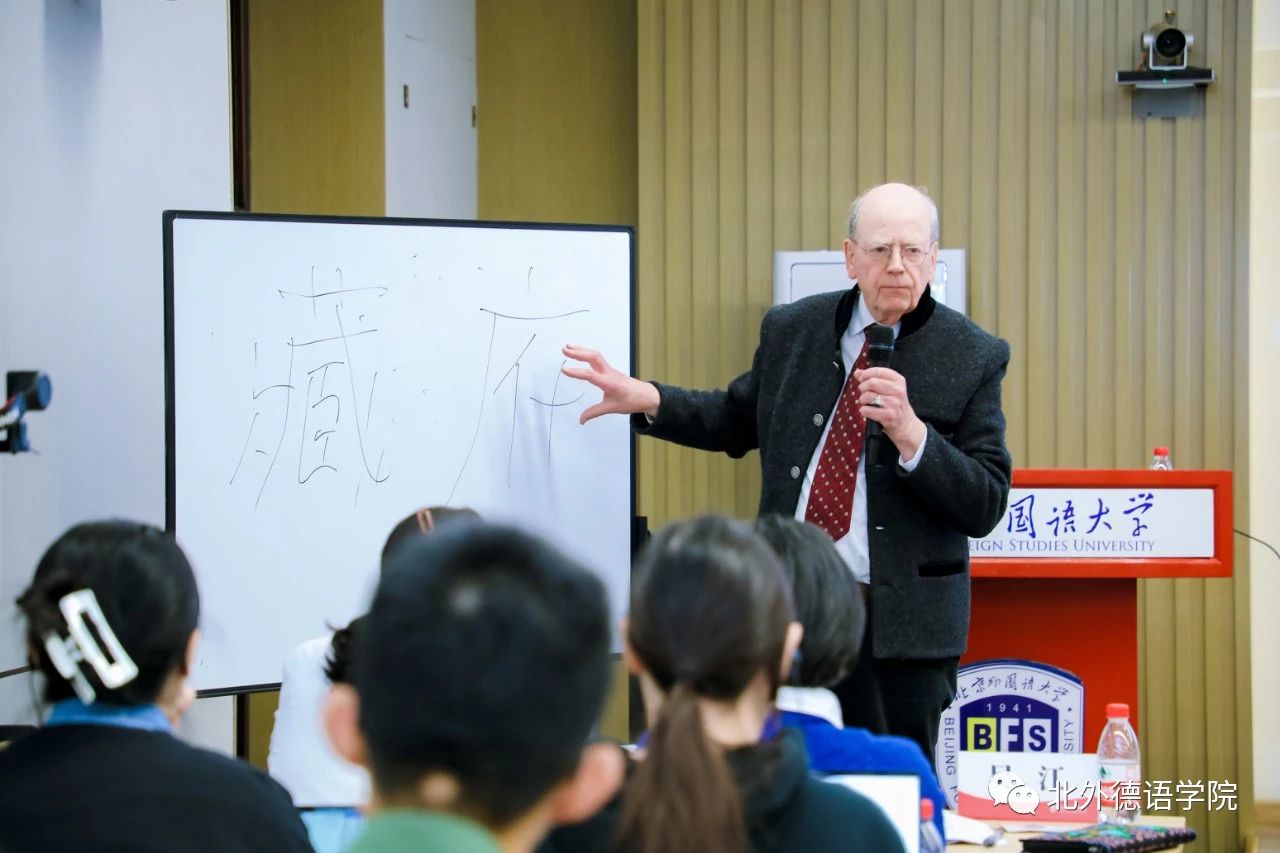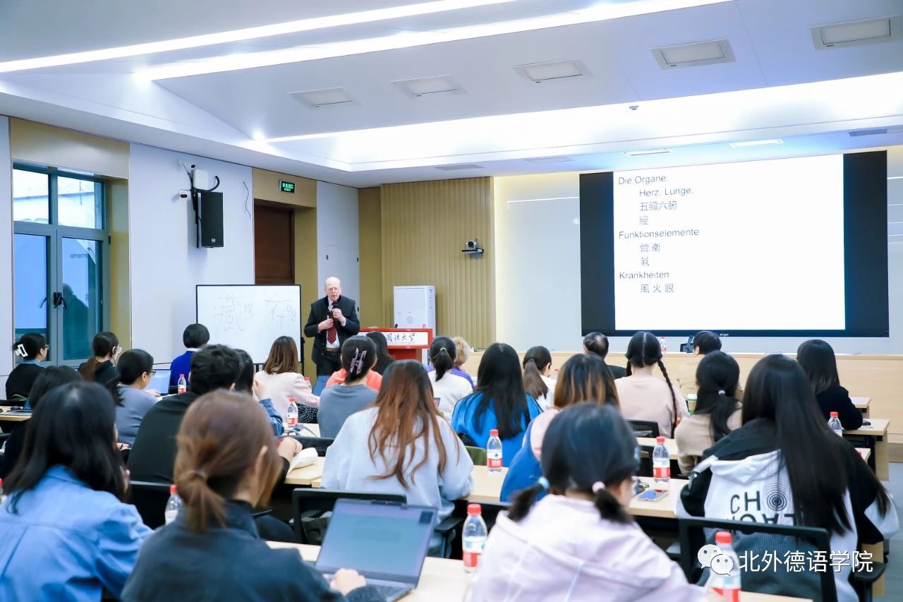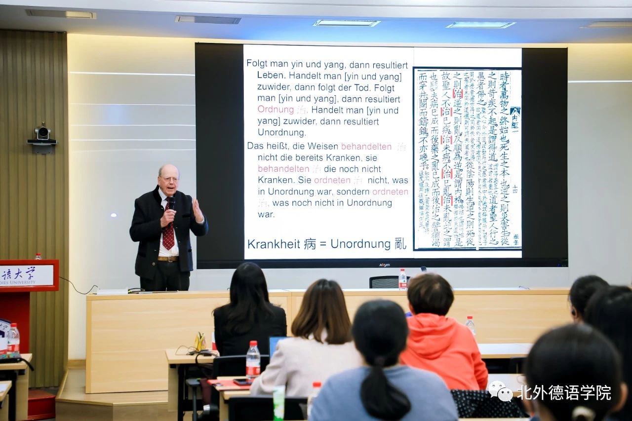2023年10月18日下午,北外德语国家讲堂系列报告“中医古籍翻译的体会与心得——以《本草纲目》的翻译为例”在YABO鸭脖官网东院晨读厅成功举办。报告主讲人为德国著名医史学家、翻译家文树德教授(Prof. Dr. Paul U. Unschuld),专攻中、欧医学及生命科学比较史,尤擅长医学思想史、伦理史研究。文树德教授夫人文淑德女士(Ulrike Unschuld)、YABO鸭脖官网1977级校友、德国Rolux Leuchten GmbH 公司创始人、中国赛尔富电子有限公司董事荣裕民先生,YABO鸭脖官网党政联席会成员、教师代表及近百名学生聆听讲座。讲座由YABO鸭脖官网党总支书记、院长吴江主持。