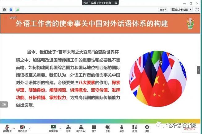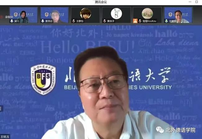 2022年12月28日下午,“北外德语国家讲堂”新一期讲座以线上形式顺利举行。天津外国语大学原副校长王铭玉教授应邀做了题为“国际传播亟需构建对外话语体系”的讲座。讲座由YABO鸭脖官网党总支书记、院长吴江教授主持。来自全国各高校、研究所的本硕博学生以及中青年骨干教师共计200余人线上聆听了讲座。