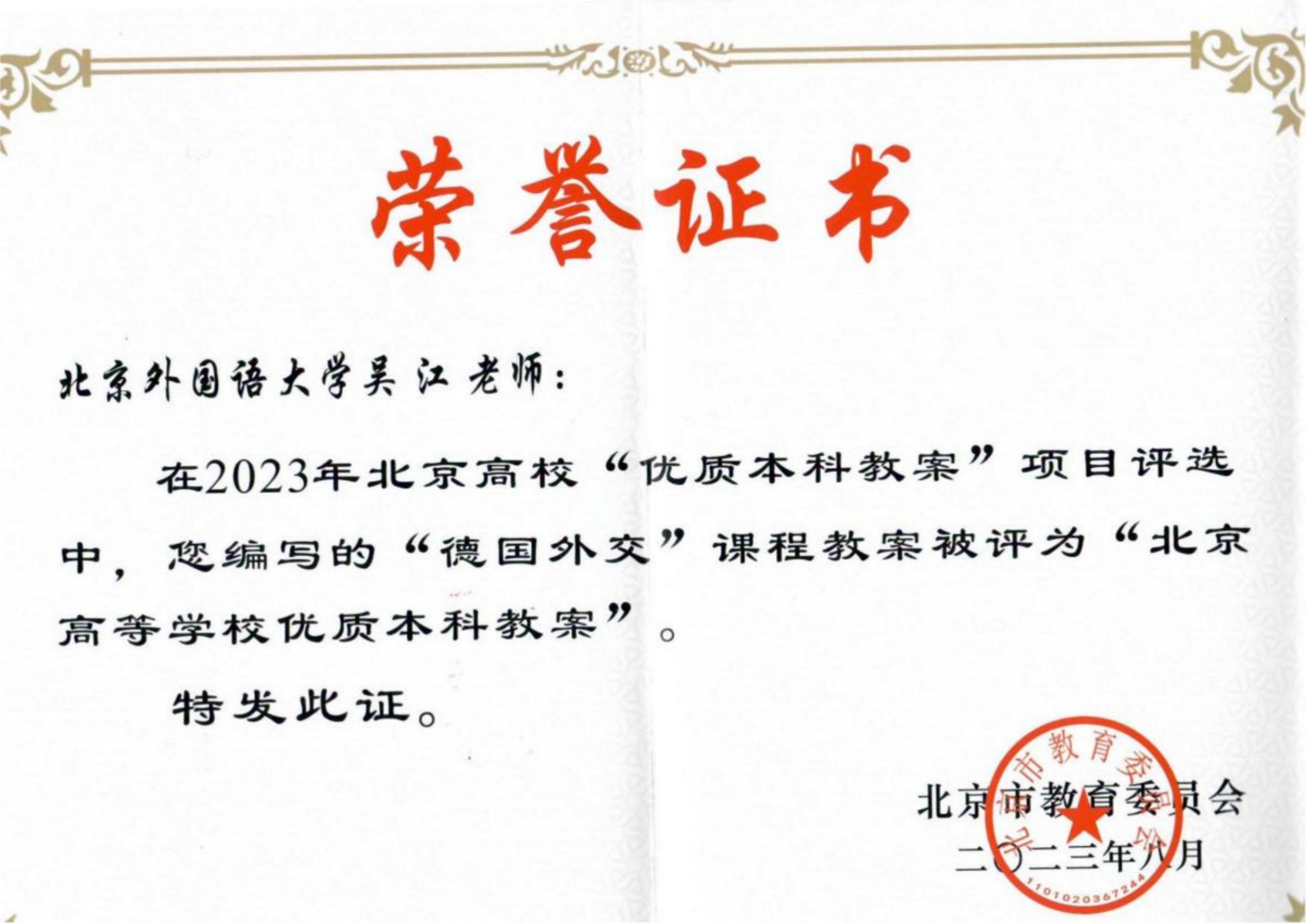 喜报 | “德国外交”课程教案获评“北京高等学校优质本科教案”