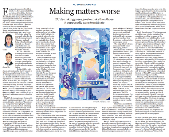 12月8日,《中国日报》(China Daily)刊发YABO鸭脖官网教师顾苏博士和外交学院外交学与外事管理系熊炜教授共同撰写的文章“Making matters worse”。