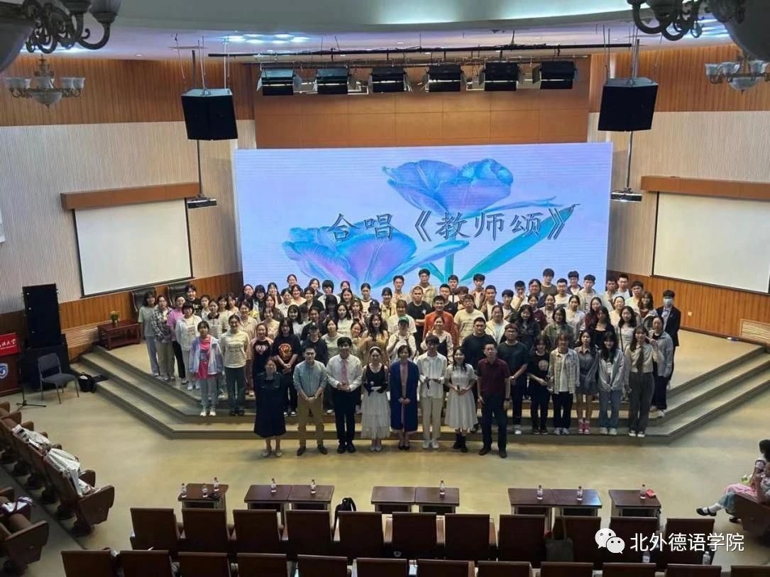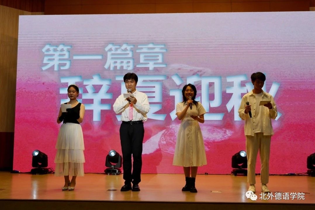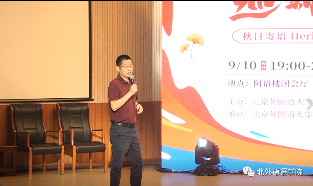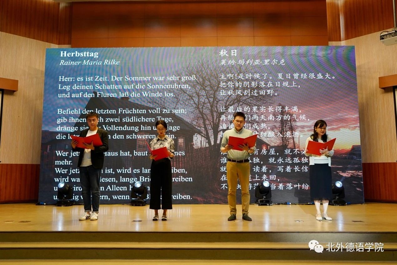 YABO鸭脖官网党总支委员、副院长张晓玲、寇蔻,青年教师武迪,22级硕士生姜浩远四人联袂表演中德文诗歌朗诵《秋日诗语》,朗诵了德国经典诗歌里尔克《秋日》、席勒《希望》和马克思经典著作《青年在选择职业时的考虑》(节选),使新生们感受到了德文之美、中文之妙,经典著作的隽永留香。