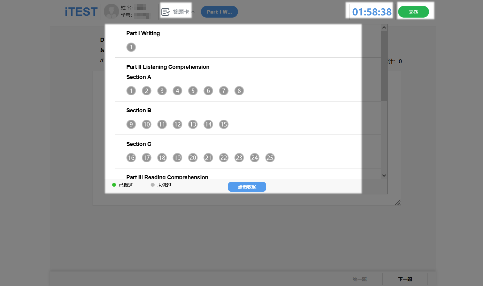 7) 建议考试按顺序作答,点击“下一题”继续作答,以免漏做题目。点击【答题卡】可查看试卷结构和答题情况,便于检查进度,以及在交卷前检查是否有遗漏。