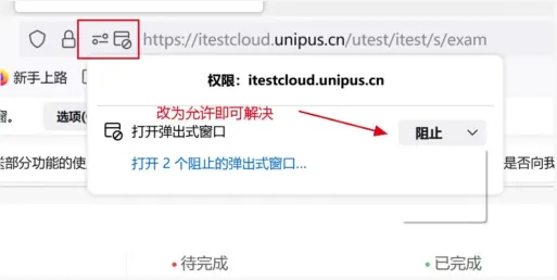 点击【进入考试】时,如页面无反应,无法看到考试界面,请确认浏览器是否屏蔽了弹窗,可在地址栏处查看,并点击【允许弹窗】。
